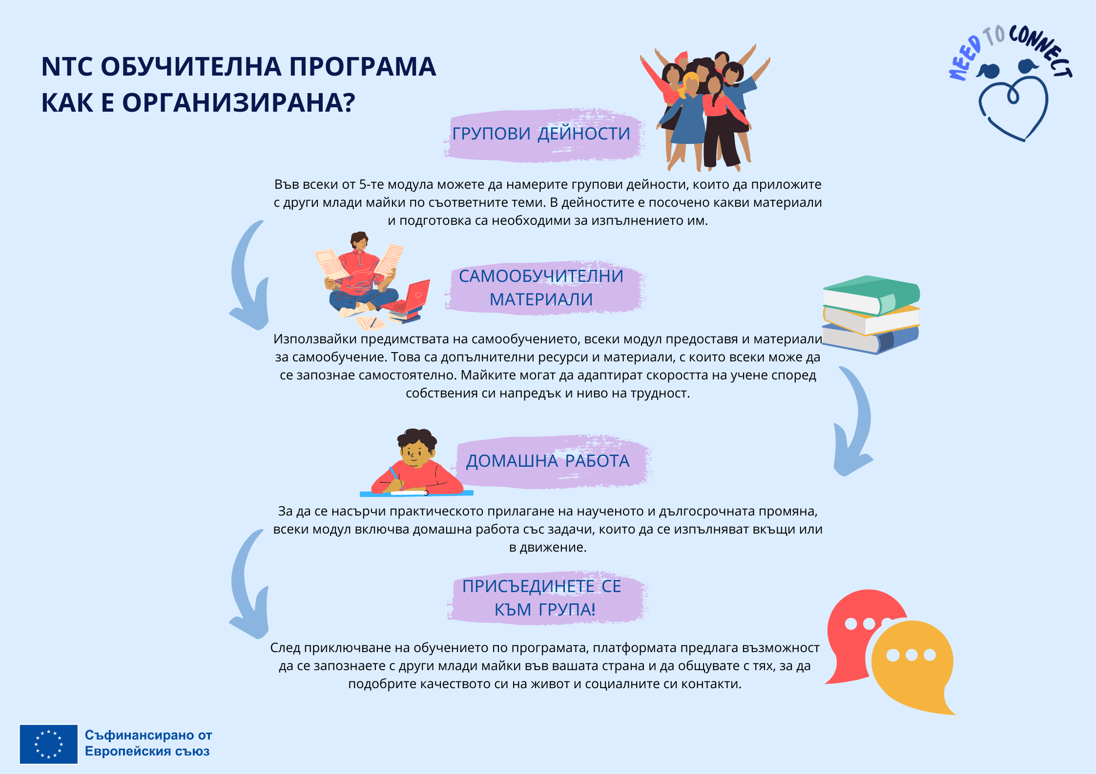 Всеки модул съдържа и материали, които подпомагат самообучението и имат за цел да бъдат проучени от всяка майка самостоятелно.